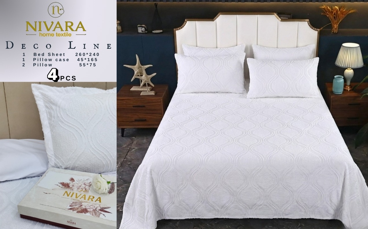 The Deco Layan model, a king-size bed, features solid colors with soft embossed patterns.