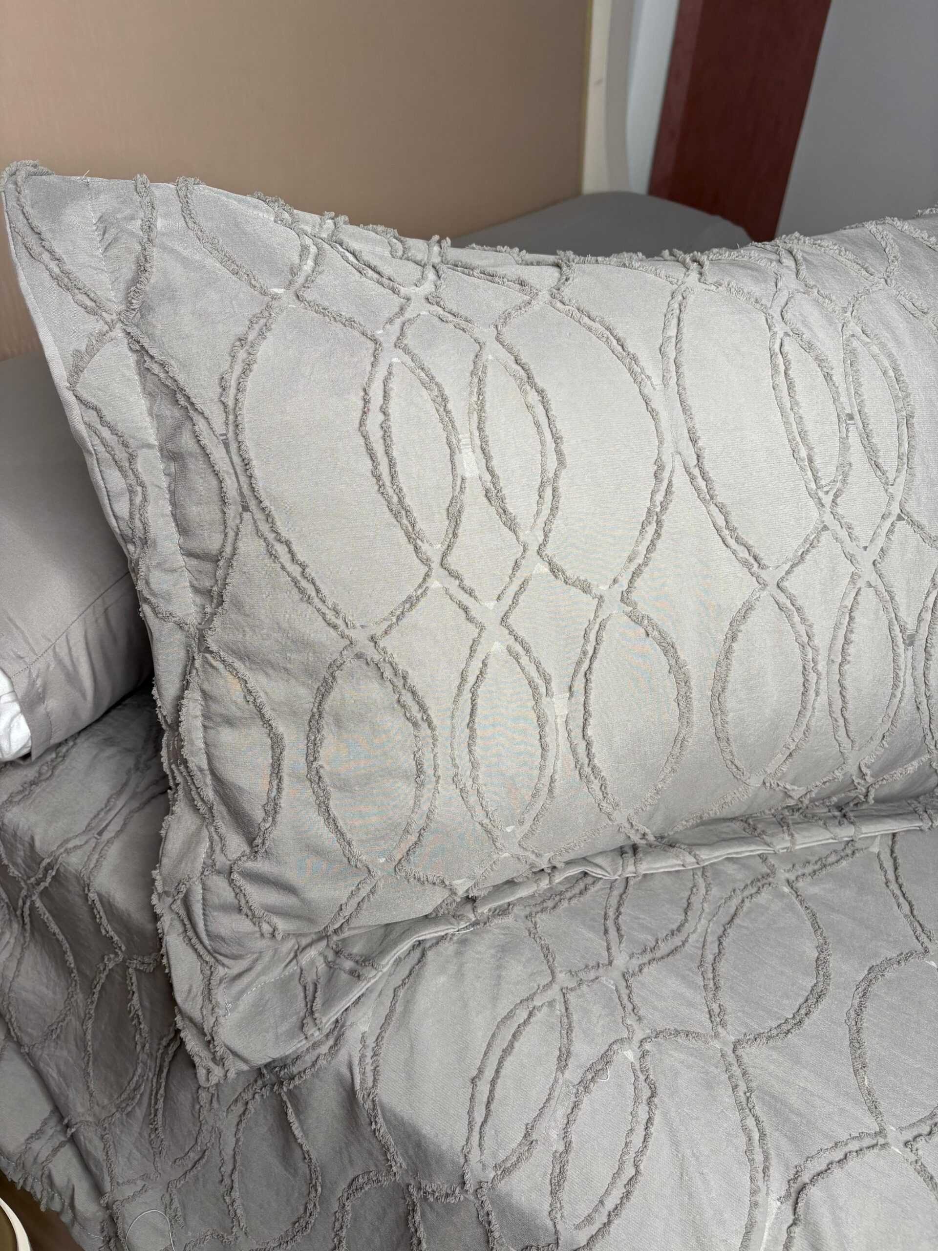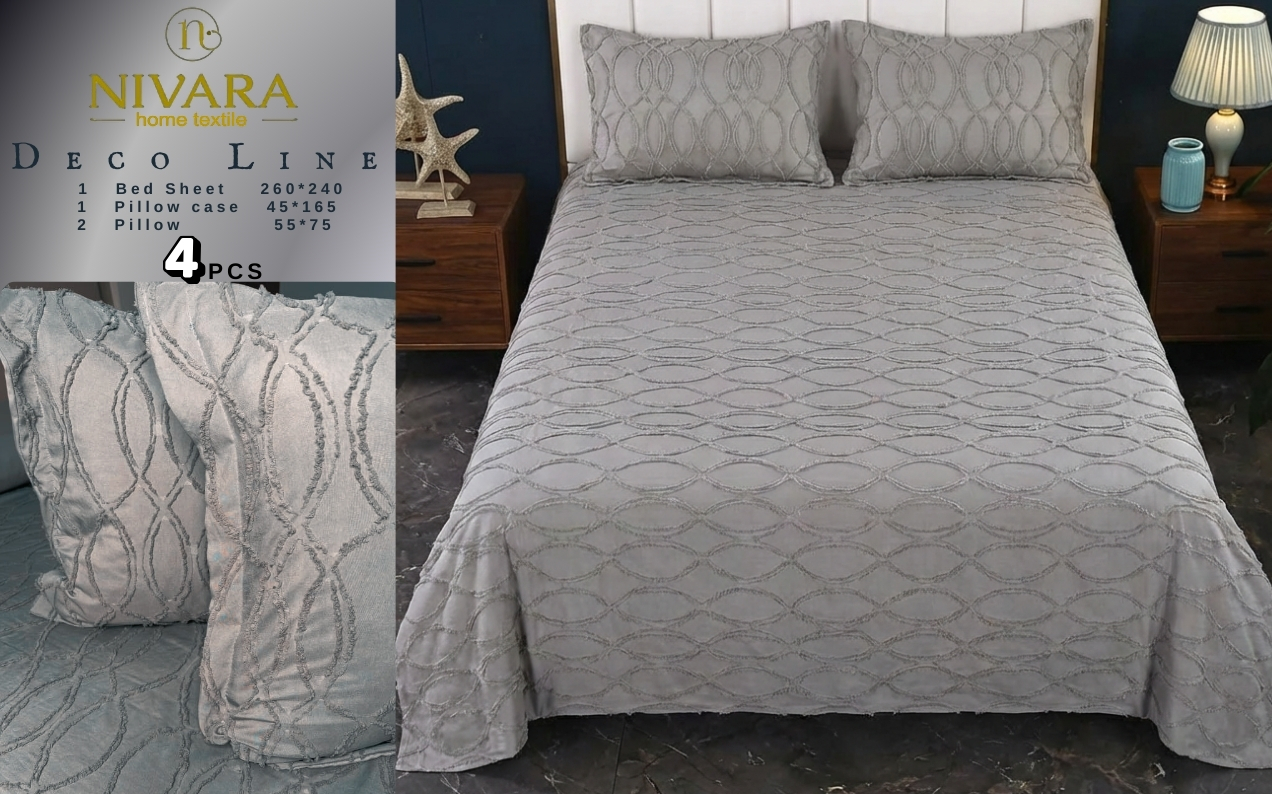 The Deco Layan model, a king-size bed, features solid colors with soft embossed patterns.