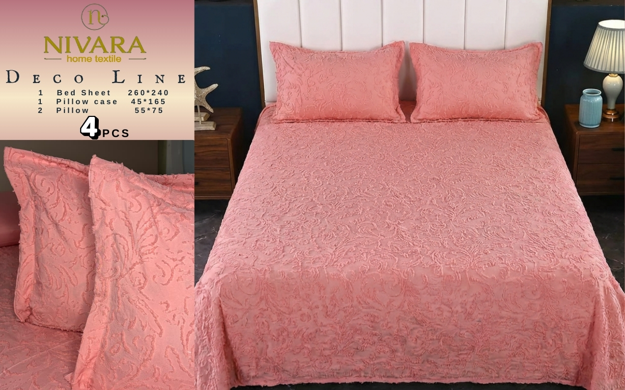 The Deco Layan model, a king-size bed, features solid colors with soft embossed patterns.